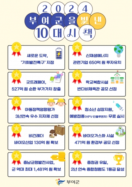 박정현 부여군수는 “2024년 부여군을 빛낸 10대 시책은 지역사회와 군민들의 협업과 노력의 결실”이라며 “앞으로도 군민들의 요구와 변화에 맞춘 선도적인 정책 추진을 통해 더 나은 부여를 만들어가겠다”고 말했다.