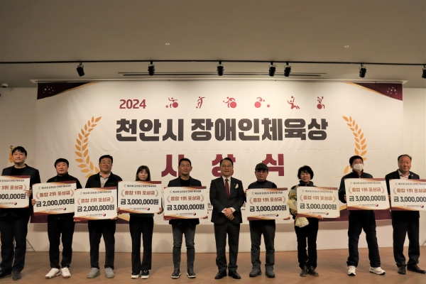 제30회 충청남도장애인체육회 천안시 선수단 해단식을 겸해 열린 ‘2024 천안시 장애인체육상 시상식’은 각종 장애인체육대회에 최선을 다한 선수단의 노고를 치하하고 올 한해 천안시 장애인체육 발전을 위해 노력하신 분들을 격려하며 유공자 표창, 우수 단체와 선수 등에 대한 시상을 진행했다.