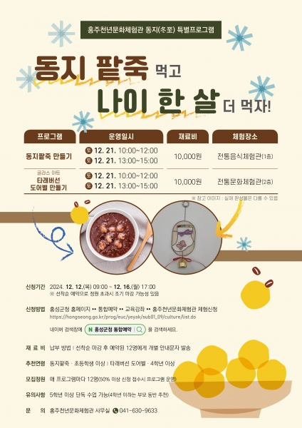 프로그램 신청은 홍성군청 홈페이지 통합예약란을 통해 진행되며 동지 프로그램은 12월 12일부터 16일까지, 크리스마스 프로그램은 12월 13일부터 16일까지 선착순으로 접수한다.