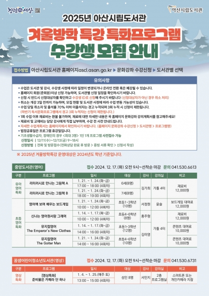 아산시립도서관, 2025년 겨울방학 특강 수강생 모집