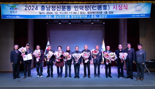 [Ytv영상스토리] 충남정신운동 청양군협의회는 어진 마음으로 크게 덕을 베풀어 주위 사람들의 덕망이 되는 자를 표창하기 위해 지난 11일 청양군 복지타운 대강당에서 수상자와 충남정신운동 회원 등 총 50여명이 참석한 가운데 ‘2024 인덕장 시상식’을 개최했다.