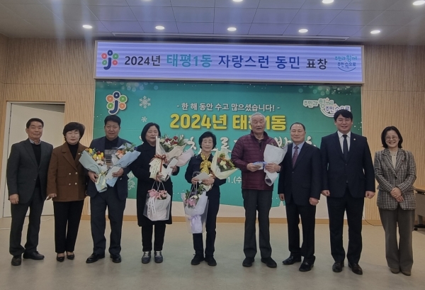 또한, 이날 태평1동 주민자치위원회는 평소 남다른 봉사 정신과 이웃사랑 실천으로 타의 모범이 되는 동민을 선발해 사회 부문과 자원봉사 부문 등 총 2개 부문, 3명에게‘2024 자랑스런 동민 표창’을 수여했다.