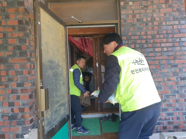 [Ytv영상스토리] 논산시 안전관리자문단은 12월 안전점검의 날을 맞이해 관내 재난 취약 가구 21가구에 대해 동절기 재난취약시설 안전점검을 실시하고 쌀 22말, 라면 22박스, 문어발 콘센트 및 전구 등을 구매해 가구당 각 1개씩을 전달 및 교체하며 위로와 격려를 전했다.