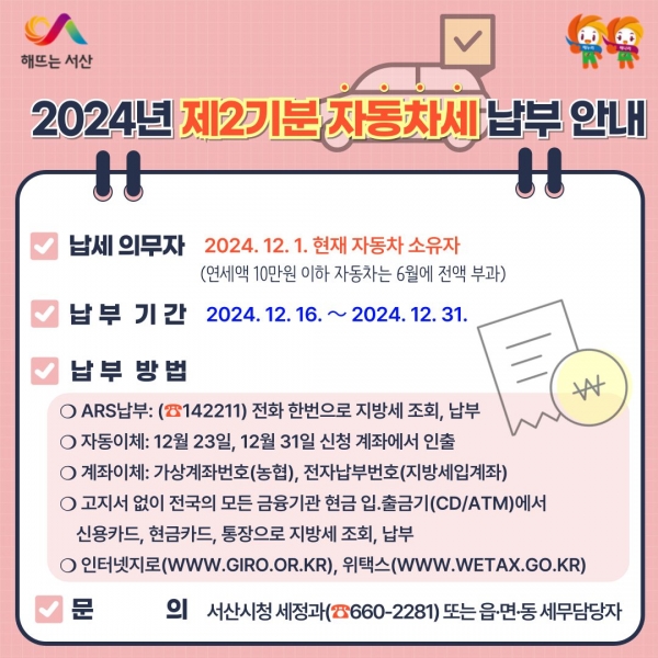 자동차세는 과세기준일인 12월 1일 현재 자동차 등록원부상 소유자에게 부과되는 지방세로 부과 대상은 서산시에 등록된 자동차, 건설기계, 125cc 초과 이륜차 소유자다.