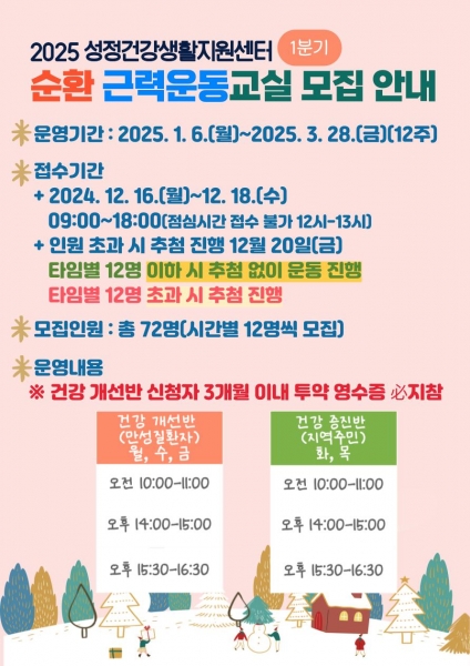 [Ytv영상스토리] 천안시 서북구보건소 성정건강생활지원센터는 성정동 주민을 대상으로 2025년 1분기 ‘맞춤형 순환근력 운동교실’ 참여자를 모집한다고 16일 밝혔다.