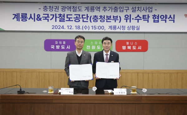 [Ytv영상스토리] 계룡시는 18일 시청 상황실에서 충청권 광역철도 사업과 연계한 계룡역 추가출입구 설치사업의 효율적 추진을 위해 국가철도공단 충청본부와 위·수탁 협약을 체결했다고 밝혔다.