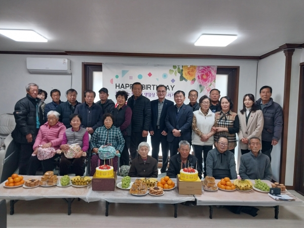 이날 마을 어르신 7명을 위해 떡과 과일 케이크 등으로 정성껏 생일상을 차리고 합동 생일 축하 자리를 마련했다.