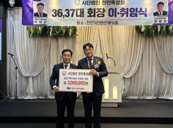 [Ytv영상스토리] 사단법인 천안흑성회가 제36대 박태준 회장과 제37대 권광회 신임회장의 이·취임을 기념하는 자리에서 천안시복지재단에 후원금 300만원을 전달했다고 20일 밝혔다.