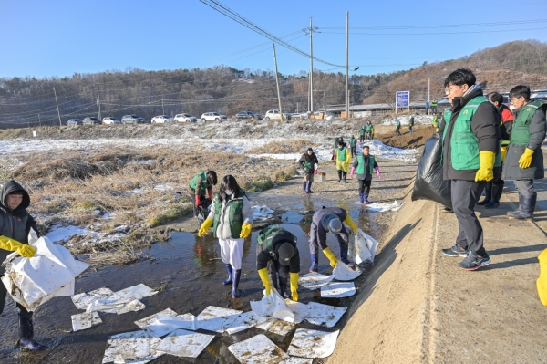 그러나 하천 물이 얼어 방제 작업에 어려움이 있는 상황이다.