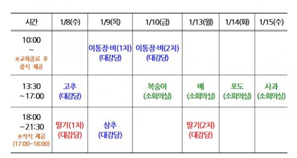 시는 총 10회에 걸쳐 △이통장·벼 △딸기 △고추 △상추 △복숭아 △배 △포도 △사과 등 8개 과정을 개설하고 약 1,500여명의 농업인을 대상으로 교육을 실시할 예정이다.