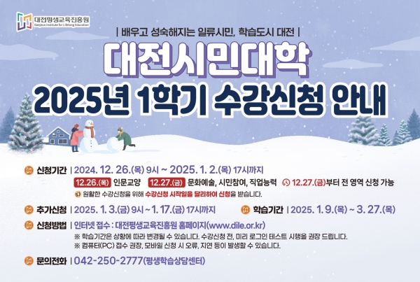 [Ytv영상스토리] 대전평생교육진흥원은 대전시민대학 2025년도 1학기 평생학습 프로그램 수강생을 12월 26일 오전 9시부터 1월 2일 오후 5시까지 선착순 모집한다.