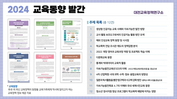 대전교육정책연구소의 교육동향은 생성형 인공지능, 2022 개정 교육과정, 통계와 빅데이터 활용 교육, 지속가능발전교육, 다문화교육, 인성교육, 세계시민교육 등의 교육 이슈가 포함되어 교육가족에게 최신 교육트렌드를 공유하고 실질적이며 깊이 있는 정보를 제공했다.