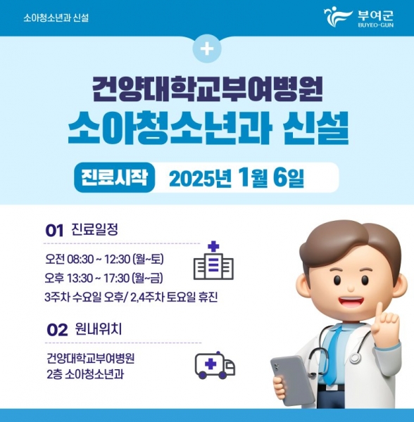 [Ytv영상스토리] 부여군은 관내 소재 건양대학교부여병원에서 소아청소년과를 신설해 1월 6일부터 본격적으로 진료한다고 밝혔다.