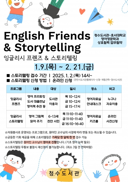 프로그램 참여 신청은 천안시 도서관 누리집에서 할 수 있으며 문의 사항은 청수도서관 영어자료실로 연락하면 된다.