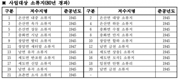 현재 군에서 관리하는 소류지는 97개소로 이중 준공된 지 80년이 경과된 C등급 노후 소류지는 총 21개소이다.
