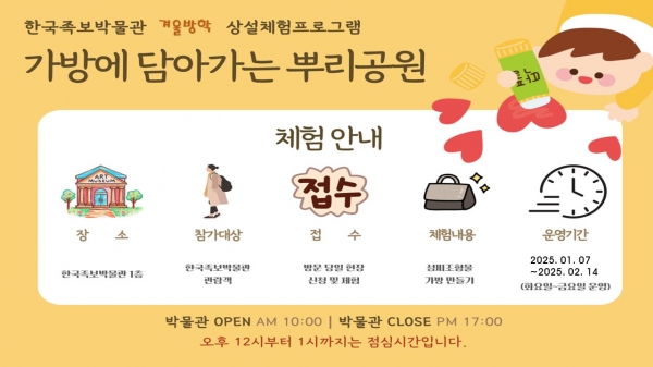 체험은 이번 달 7일부터 2월 14일까지 박물관 휴관일과 공휴일을 제외한 평일 오전 10시부터 오후 5시 사이에 누구나 박물관을 방문해 현장 신청으로 참여할 수 있다.