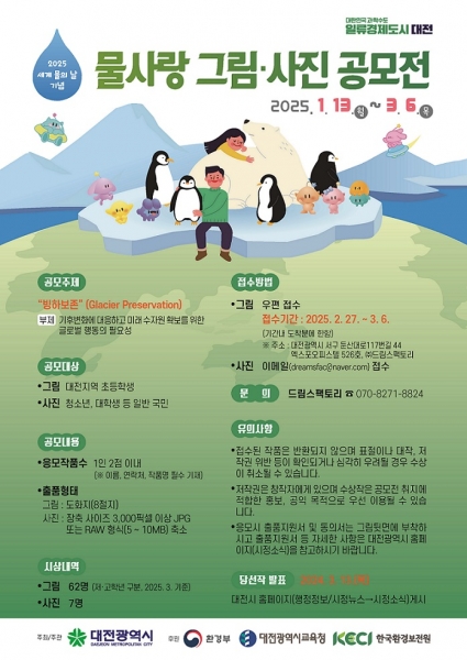 [Ytv영상스토리] 대전시는 3월 22일 세계 물의 날을 맞아 유엔이 정한 2025 세계 물 환경 주제인‘빙하보존’을 내용으로 1월 13일부터 3월 6일까지 ‘물사랑 그림 · 사진 공모전’을 개최한다.