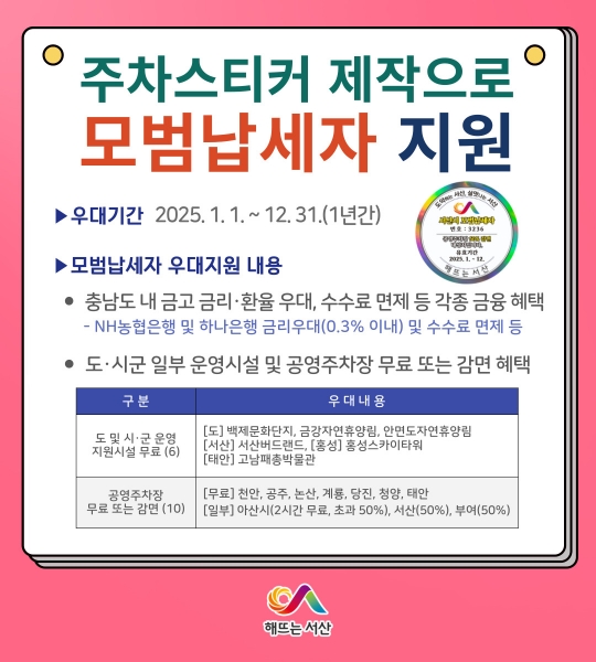 서산시, 모범납세자 차량 부착용 주차스티커 제작