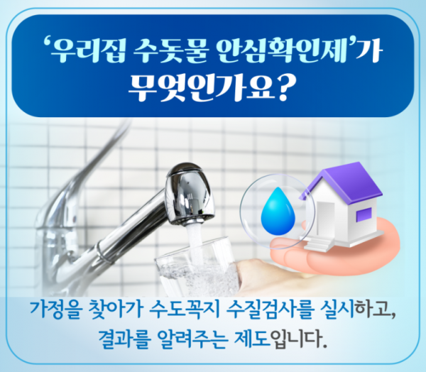 수돗물 안심확인제는 수돗물 수질에 이상이 있다고 생각되거나 수질 상태가 궁금한 수용가에서 신청하면 수질검사 전문가가 신청 가정을 방문해 수돗물을 검사하고 결과를 무료로 안내해주는 제도이다.