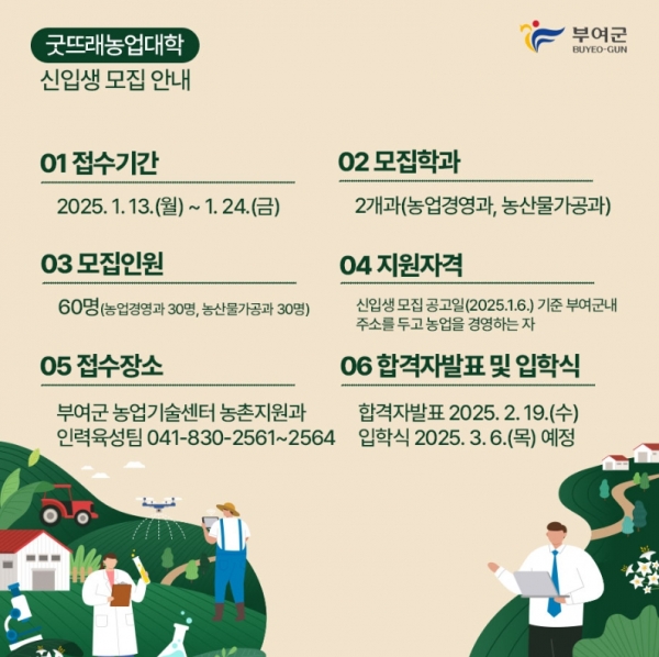 농업경영과와 농산물가공과 2개 과정 각 30명에 대해 총 60명을 대상으로 오는 24일까지 2025학년도 굿뜨래농업대학 신입생을 모집한다.
