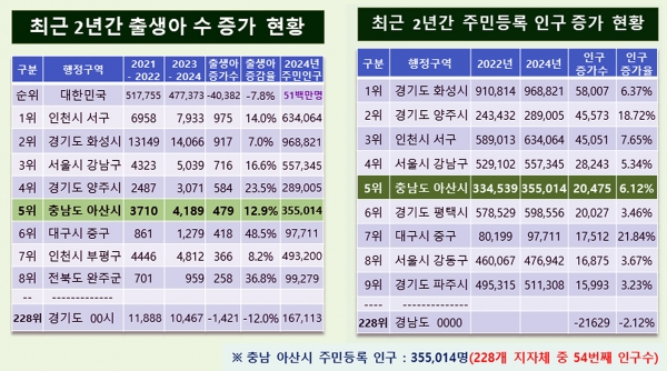 전국적으로 최근 2년간 출생아 수는 4만 382명 감소한 반면, 아산시는 479명 증가했다.