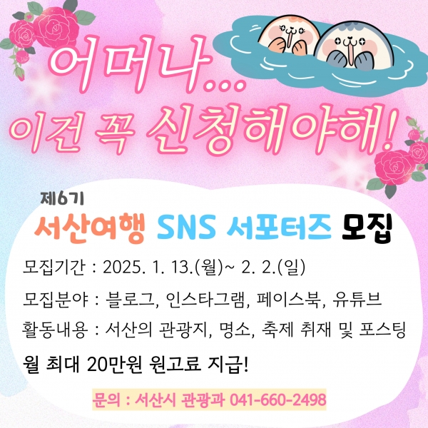 오은정 서산시 관광과장은 “꽃이 피는 3월부터 잎이 떨어지는 10월까지 서산의 다양한 모습을 담아 함께 소개해 주실 분들의 적극적인 참여를 바란다”며 “직접 현장에서 취재하고 제작하는 콘텐츠를 통해 서산의 관광 명소 및 숨은 비경을 널리 알리고 다양한 계층의 관광객들에게 매력적인 관광도시 서산을 소개할 수 있을 것”이라고 말했다.