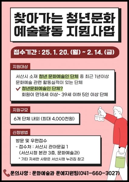 김기윤 서산시 문화예술과장은 “청년 예술인들의 예술적 기량을 선보일 기회에 대한 열망이 크다”며 “이번 지원사업을 통해 청년들의 역량을 마음껏 펼치며 젊은 예술인들의 힘을 보여주기를 기대한다”고 말했다.