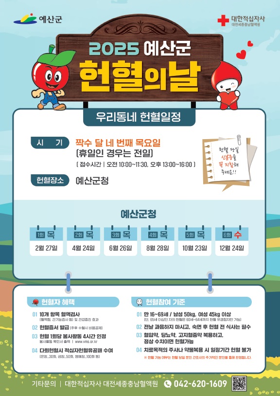 헌혈을 희망하는 만 16세 이상 69세 미만 군민은 짝수달 넷째 목요일마다 오전 10시부터 오후 4시까지 군청 앞 헌혈 버스에서 간기능, 간염 검사 등 10개 항목 혈액검사를 받을 수 있으며 주민등록상 주소가 예산군인 군민의 헌혈 참여 시에는 예산사랑상품권을 제공한다.