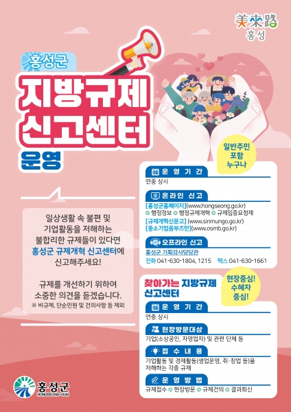 또한 군은 올해부터 군민들이 일상 속 또는 경제활동 중 불편했던 규제사항을 보다 쉽게 건의할 수 있도록 읍·면 행정복지센터, 사업소 등 내에도 ‘홍성군 지방규제신고센터’ 창구를 상시 운영할 계획이다을 밝혔다.