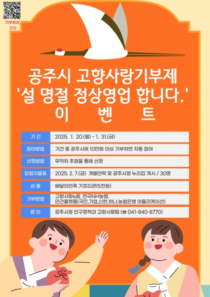 이번 이벤트는 1월 20일부터 31일까지 12일간 진행되며 △고향사랑e음 △민간 플랫폼 △전국 NH농협을 통해 공주시에 10만원 이상 기부하면 자동으로 응모된다.