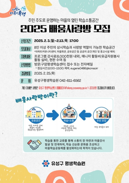 [Ytv영상스토리] 대전 유성구는 2월 3일부터 13일까지 주민들이 가까운 곳에서 학습과 교류를 즐길 수 있는 열린 학습 공간 ‘배움사랑방’을 모집한다고 밝혔다.