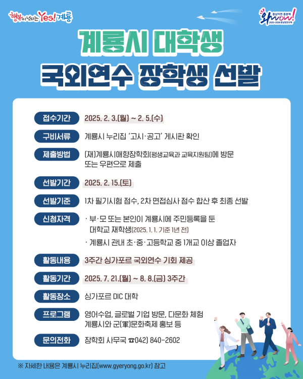 [Ytv영상스토리] 계룡시애향장학회가 2025년 ‘대학생 국외연수’장학생 20명을 선발한다고 밝혔다.