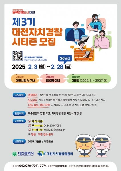 대전자치경찰위원회는 ‘제3기 자치경찰시티즌’을 2월 28일까지 공개 모집한다고 밝혔다.