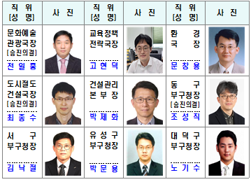 자치구 인사 교류는 구청장들의 의견을 적극 반영해 조성직 과장을 동구 부구청장으로 승진 발령하고 김낙철·박문용·노기수 국장을 각각 서구·유성구·대덕구 부구청장으로 교류한다.
