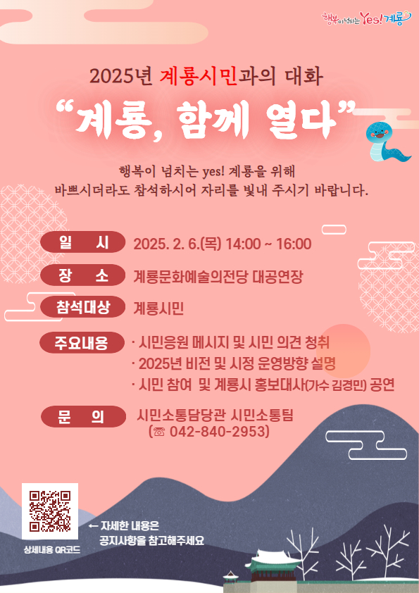행사는 시민들과 공무원이 한자리에 모여 2025년 계룡시의 주요 시정 계획을 공유하고 시민이 일상생활에서 체감하고 공감할 수 있는 정책방향을 모색하는 자리로 구성된다.