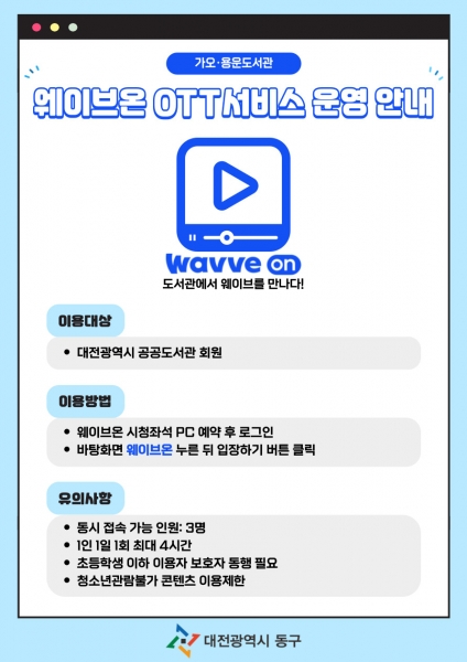 ‘웨이브온 OTT서비스’는 대전시 공공도서관 회원이라면 가오도서관과 용운도서관의 웨이브온 시청 좌석에서 무료로 이용할 수 있으며 이용시간은 1일 1회 최대 4시간까지이다.