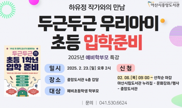 신청은 예비 초등학생 자녀의 학부모라면 누구나 가능하며 2월 6일 오전 9시부터 아산시립도서관 누리집에서 할 수 있다.