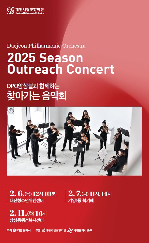 한편 ‘찾아가는 음악회’는 △3월 26일 11시 대전맹학교 △5월 13일 11시 정다운어르신복지관 △5월 14일 오후 2시 행복한 어르신복지관에서 추가로 개최될 예정이다.