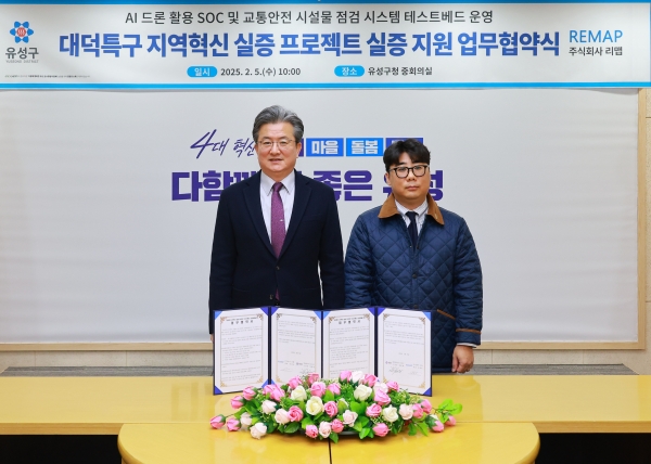 주요 협력 내용은 △성공적인 사업 추진을 위한 인프라 및 정보 교류 △AI 드론 활용 교통안전 시설물 점검 시스템 운영 △사용자 의견 수렴을 통한 기능 보완 및 사업화 지원 등으로 앞으로 유성구와 ㈜리맵은 긴밀한 협력체계를 구축할 예정이다.