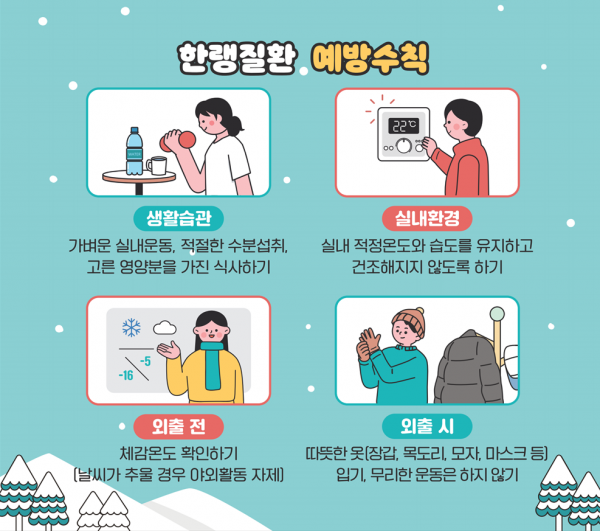한랭질환을 예방하기 위해서는 △올바른 생활습관 실천 △실내 적정 온·습도 유지 △외출 전 체감온도 확인 △외출 시 따듯한 옷 입기의 생활 속 실천으로 한랭질환 예방수칙을 준수하는 것이 중요하다.