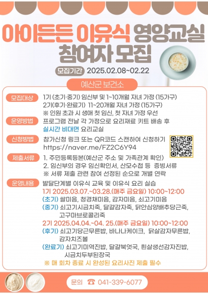 [Ytv영상스토리] 예산군보건소는 관내 임신부 및 20개월 이하 자녀를 둔 가정을 대상으로 ‘아이든든 이유식 영양교실’ 참여자를 오는 2월 8일부터 22일까지 모집한다.