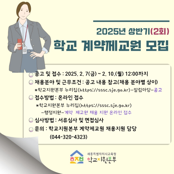 [Ytv영상스토리] 세종시교육청학교지원본부은 휴직 등으로 발생하는 교원의 결원 대체 인력을 채용하기 위해 2025학년도 상반기 학교 계약제 교원을 모집한다.