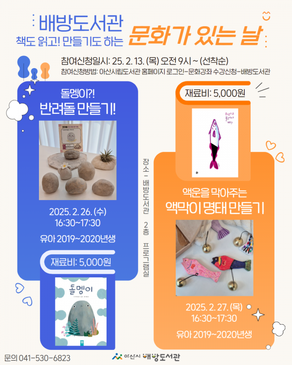이번 2월 문화가 있는 날 프로그램은 함께 그림책을 읽고 그에 관련된 만들기 활동을 할 수 있는 독 후 연계 프로그램으로 26일은 ‘돌멩이? 반려돌 만들기’, 27일은 ‘액운을 막아주는 액막이 명태 만들기’ 가 진행된다.