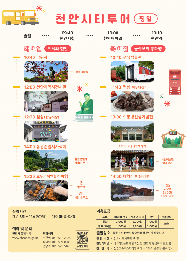 올해 천안시티투어는 3월부터 11월까지 9개월간 매주 화·목·토·일요일 주 4회 운행된다.
