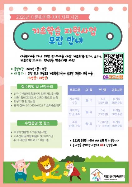 태안군에 따르면, 태안군가족센터는 올해 취학 전·후 다문화 가정 자녀에 기초한글 및 수학 등의 학습지원을 무료로 제공하는 ‘2025년 기초학습지원 사업’을 추진한다.