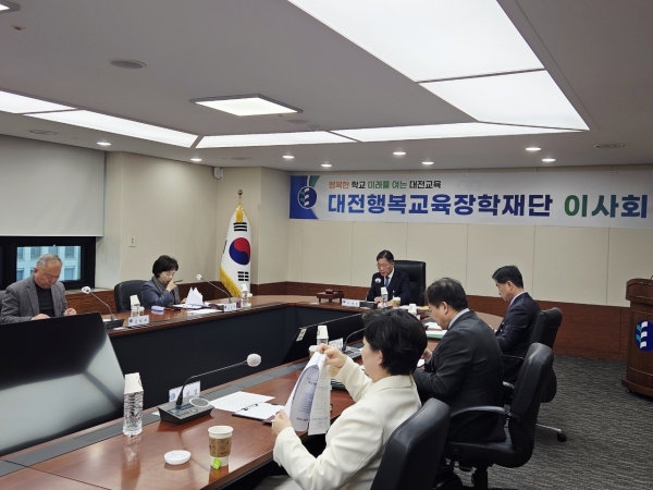 이날 이사회에서는 2024년도 세입·세출 결산, 2024년도 기부금 사용계획, 임원 선임, 대전행복교육선발심의위원회 구성, 기본재산 변경을 위한 정관 변경 등 대전행복교육장학재단에서 제출한 5개 안건에 대한 심의가 이뤄졌다.