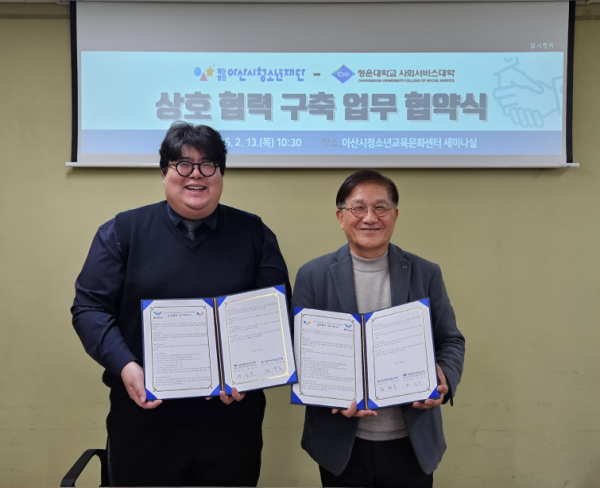 [Ytv영상스토리] 아산시청소년재단은 12일 청운대학교 청소년상담교육학과와 상호협력을 위한 업무 협약을 체결했다고 밝혔다.