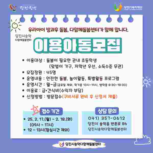 접수 기간은 오는 17일~18일로 이틀간이며 당진시송악다함께돌봄센터로 방문해 신청하면 된다.