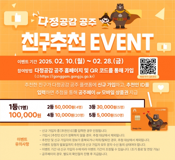 시는 기존에 가입한 시민 패널이 추천한 친구가 ‘다정공감 공주’에 신규 가입하고 추천인 아이디를 입력한 패널을 대상으로 80명을 추첨해 공주페이나 모바일 상품권을 차등 지급하는 이벤트를 이달 말까지 실시한다.