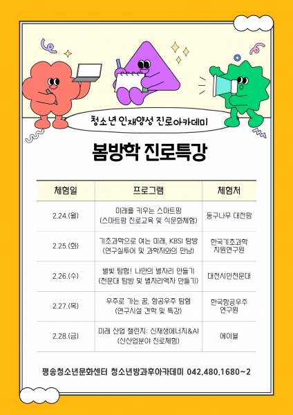[Ytv영상스토리] 대전시는 평송청소년문화센터 주관으로 청소년 인재 양성 진로 아카데미‘봄방학 진로 특강’ 프로그램을 오는 24일부터 28일까지 운영한다.